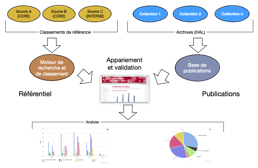 Ce système s’adresse aux institutions de recherche qui ont choisi Hal (https://hal.archives-ouvertes.fr/) pour déposer et gérer leurs publications scientifiques. HAL est très utile mais présente le double inconvénient de fournir d’une part une classification assez sommaire (soit, essentiellement, “Article” et “Communication”), et d’autre part d’être très permissif sur les données qui peuvent être déposées. Le risque est une incitation inflationiste au dépôt de publications de portée très variable, et une difficulté à identifier les publications les plus significatives.